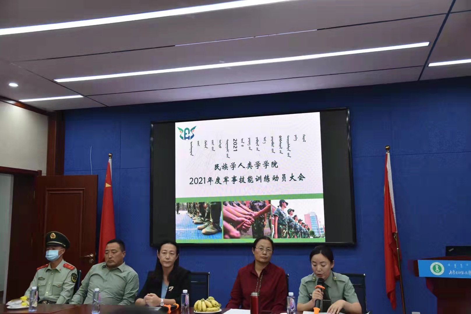 为了2021级新生军训工作顺利开展,beat365官网于2021年9月18日下午分别在赛罕校区田家炳教育书院615学术报告厅和盛乐校区行知楼207教室举行了2021年军事训练动员大会。出席两次大会的有beat365官网党委书记包凤兰、党委副书记阿荣、团总支书记朱苏道、学工办主任包双成、学工办老师姜鑫、班主任陈引弟、胡那斯图老师以及军训教官黄欢、张立,民人院全体2021级本科生。