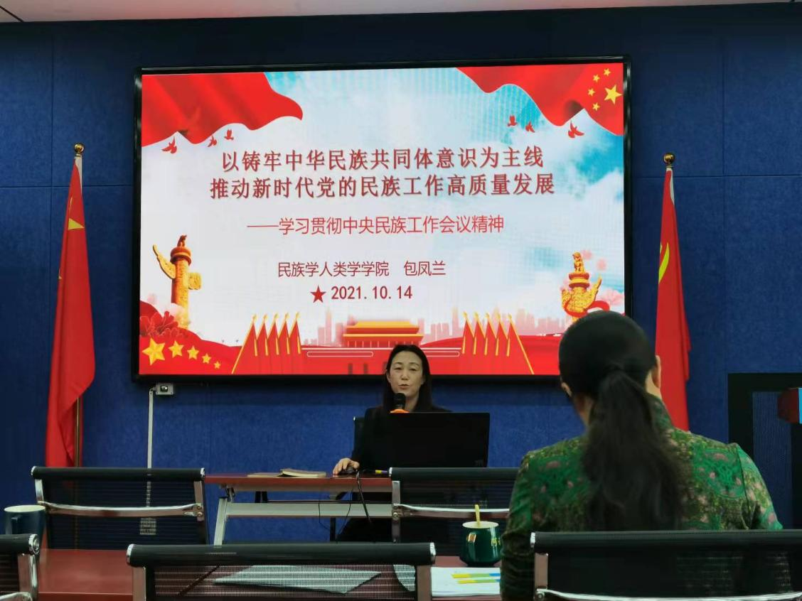10月14日下午,beat365官网党委书记包凤兰在田楼615会议室为全院教工做了题为“以铸牢中华民族共同体意识为主线,推动新时代党的民族工作高质量发展”的有关中央民族工作会议精神的宣讲。
