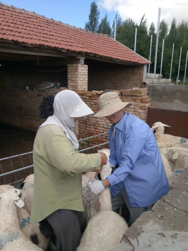 入住达林台嘎查牧民家的同学协助喂羊驱虫药