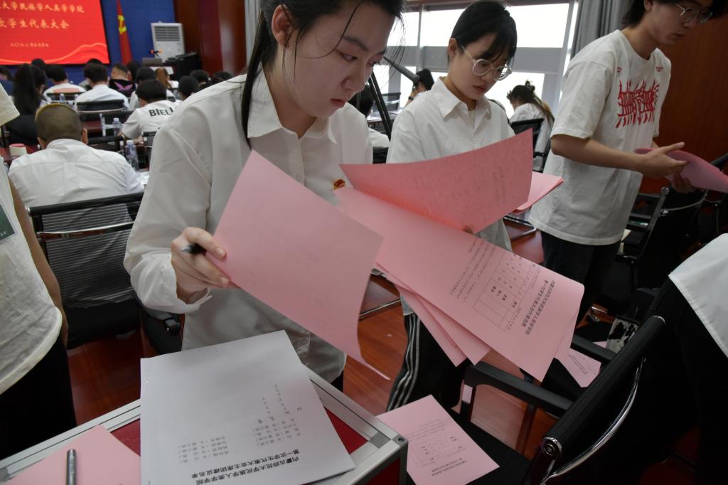 大会进行第三项,在学生代表共同进行公平公正公开投票后,确认第四届学生委员会主席团本科生成员为包雅茹、王应应、杨聪慧,研究生成员为黄胜楠、旭斌、卓拉。(按拼音顺序)