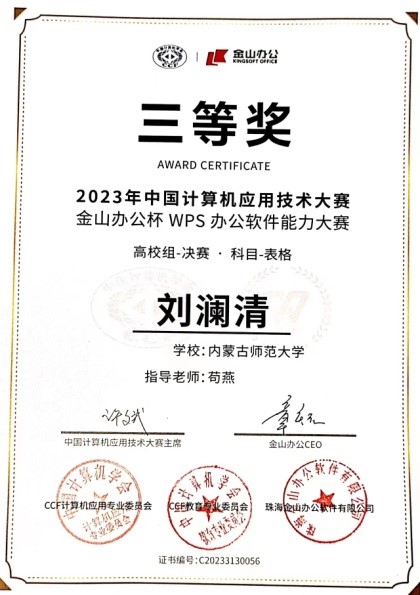 beat365官网2022级社会学3班刘澜清同学在学校选拔赛中荣获“表格赛道”第一名,并被选派代表学校参加了全国总决赛。在全国总决赛中,我校荣获高校组团体第六名,刘澜清同学荣获高校组“表格赛道”个人三等奖。