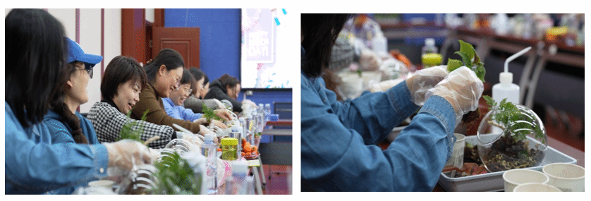 活动现场,苔藓、多肉、蕨类植物与彩色砂石错落陈列,圆形玻璃器皿象征“圆满和谐”的文化寓意。专业指导老师示范如何分层铺设土壤、搭配绿植与装饰。女教师们化身“微观设计师”,指尖流转间,一件件融合个人巧思的作品渐次成型;方寸天地中,女性柔美与坚韧并存的创造力展露无遗。