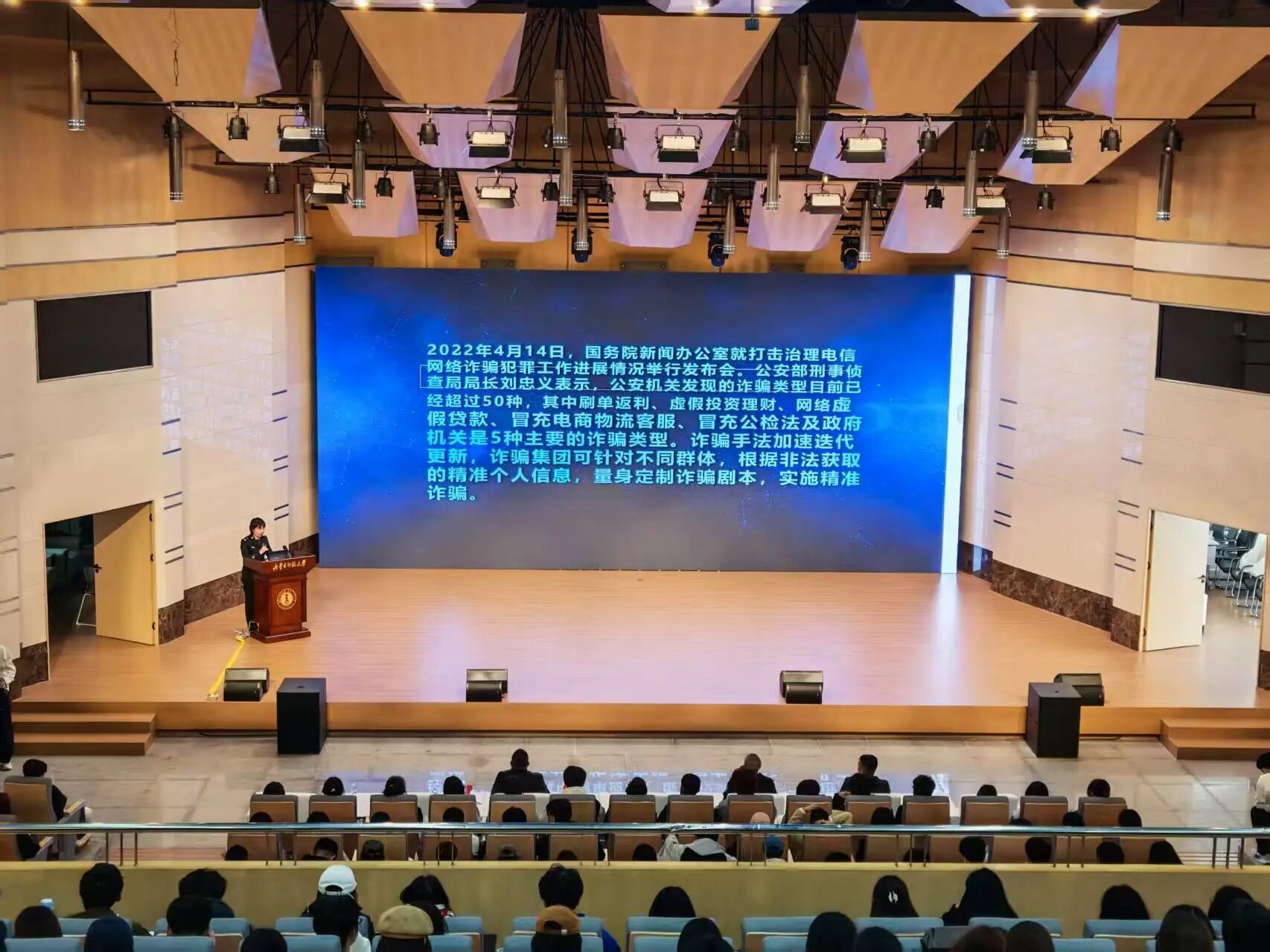 讲座主讲人王璐警官结合多起典型案例,深入剖析网络诈骗的严重危害,一针见血地揭露了各类诈骗手段背后的隐秘“陷阱”,并针对常见骗局为同学们传授实用的识骗、防骗技巧。