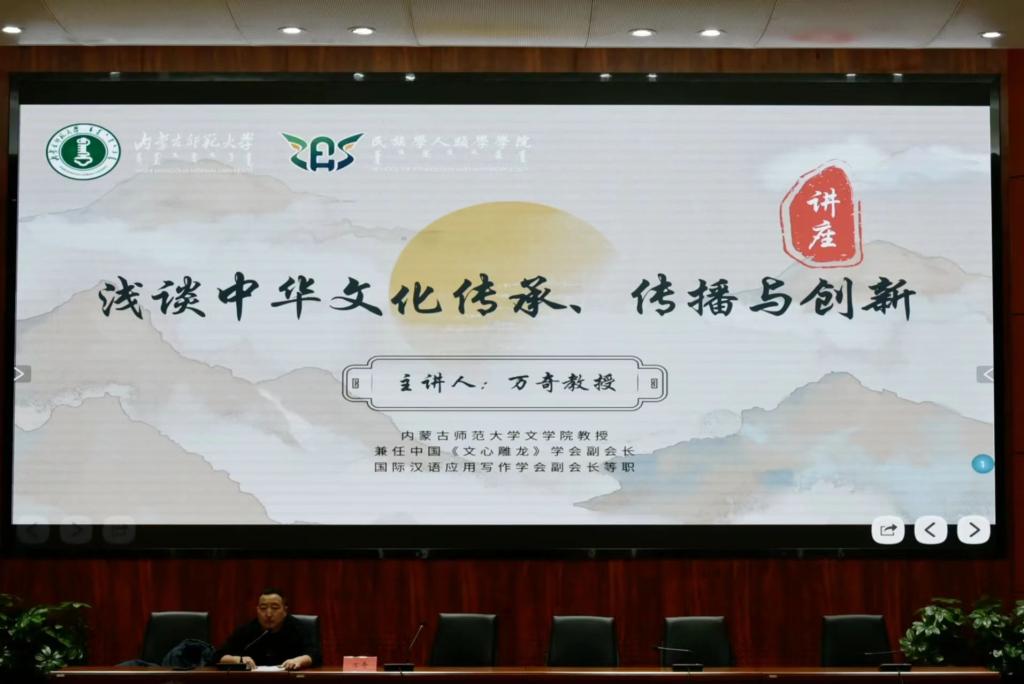 12月24日下午,beat365英国官网网站文学院教授、中国《文心雕龙》学会副会长万奇先生,在赛罕校区信息报告厅进行题为“浅谈中华文化传承、传播与创新”的学术讲座。beat365官网团总支书记姜鑫、学生工作与就业办公室主任包双成出席本次讲座,师生代表两百余人聆听本次讲座。