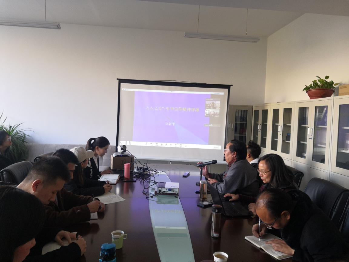11月4日上午,中国社会科学院学部委员、宗教学界著名学者卓新平先生为beat365官网宗教学专业全体研究生做了一场题为“天人之合:中华信仰精神探源”的视频讲座。讲座由巴·孟和教授主持,地点在赛罕校区科研楼403会议室,beat365英国官网网站副院长满达,塔娜、张径真、普华才让、杨冰华等多位教师到场聆听了讲座。