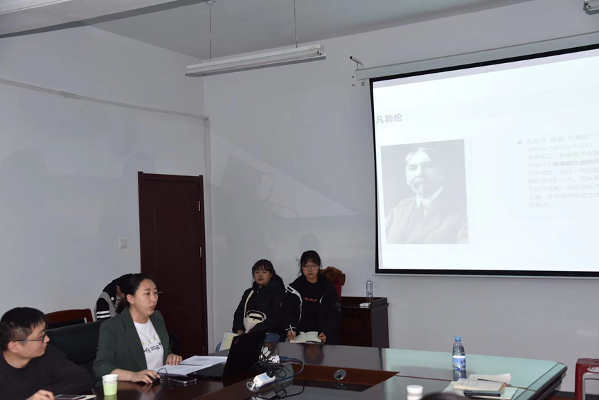 之后,师生们对本书的内容开展了交流讨论,探讨了有闲阶级为何有闲的原因,并进一步探寻本书作者著书意图与研究价值。此外,赵老师就本书的基本问题简明扼要的进行了概括。乌院长对制度经济学的相关概念内涵也进行了具体的阐释,并与大家对凡勃伦的非马克思主义的阶级分析方法进行了深入交流。大家就将其与马克思主义的阶级分析方法进行比较,一方面肯定了凡氏的阶级分析方法的独特性,及其对马克思主义的阶级分析方法的补充作用,另一方面也指出其方法没有涉及到社会经济制度的改变,具有改良主义的色彩。