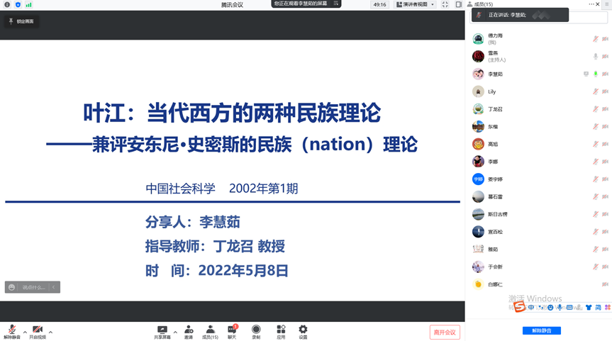 李慧茹同学汇报的论文为叶江《当代西方的两种民族理论——兼评安东尼·史密斯的民族(nation)理论》,发表在《中国社会科学》2002年第1期。汇报者从作者叶江与安东尼·史密斯的因缘际遇入手,分享论文的写作背景,并且梳理了当代西方民族理论研究范式,进而针对本篇论文中主要涉及到的两种民族理论进行了介绍。该论文虽发表年限较久,但经典论文至今仍有启迪作用。没有完美的理论,理论的产生有其重要的时代背景和适用范围。我国学界进行中华民族共同体研究要立足于本土,建立中国特色的理论框架,借鉴西方理论中合理论述部分,学习西方学术流派客观的理性分析方法和治学态度。