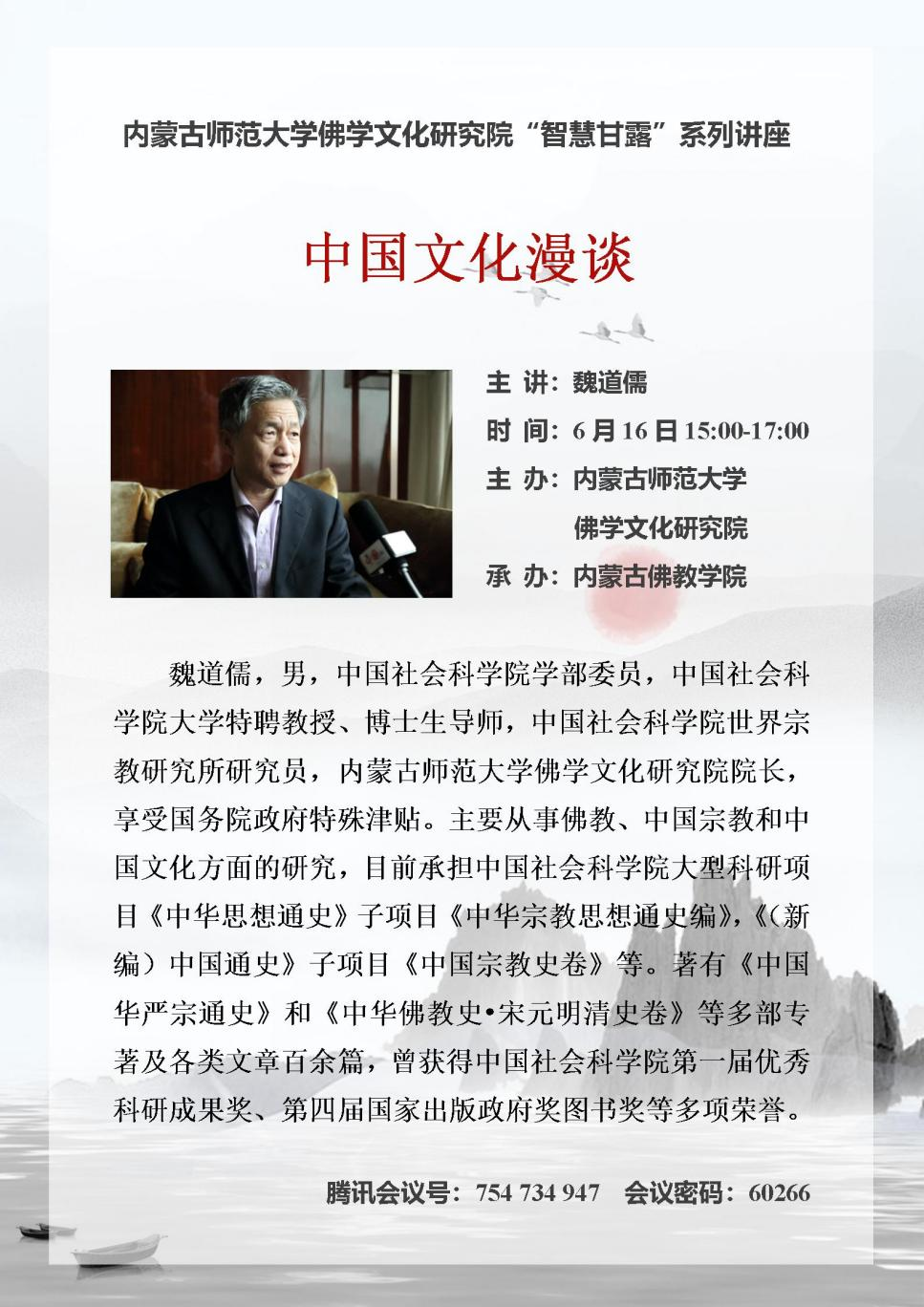6月16日下午,中国社会科学院学部委员、我校佛学文化研究院院长魏道儒先生应邀做客“智慧甘露”系列讲坛,在线上为beat365官网师生做了题为“中国文化漫谈”学术讲座。讲座由副院长满达主持,宗教学专业全体师生及内蒙古佛教学院院长布仁满都拉等全体师生聆听了讲座。